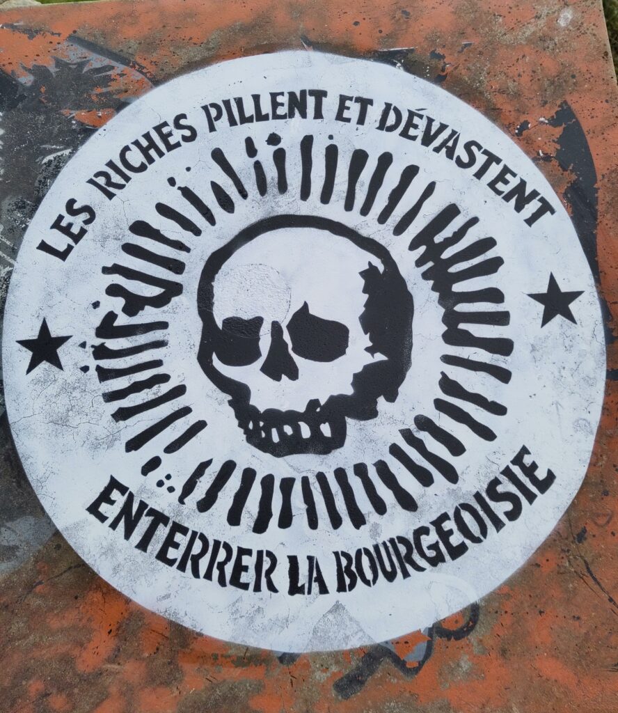 Riches désigne la classe sociale qui dirige le travail et l’économie (ou ultra riches, pas le voisin qui touche 3 ou 4000 balles par mois) avec des projets écocidaires d’ampleur international, par exemple Bolloré avec Total et son mégaoléoduc en Ouganda.Pyrénées AntifaNi sha ni ayatollah. Mahsa Amini.FuriosaDes années que Macron et ses sbires font monter sciemment le RN, des années qu’ils salissent la gauche, des autonomes à LFI. Il a laissé le fascisme prendre les leviers essentiels de la société comme les médias, la police vote RN de bas en haut de l’appareil, sans parler de l’armée. L’extrême droite est déjà au pouvoir, si le RN passe le stade final sera atteint. Le fascisme n’est pas le contraire de la démocratie, mais son évolution par temps de crise. Les représentants de la bourgeoisie étant totalement décrédibilisés (PS, LR, Macronie) il ne lui reste que son dernier atout: le fascisme avec le RN. Prenons la rue, soyons solidaires, l’abject Macron nous livre au chaos.Des mégabassines à la Kanaky, en passant par la cause palestinienne et l’A69: le sabotage.« À bas le colonialisme »« En 2015, la chanteuse Nûdem Durak a 22 ans lorsqu’elle est condamnée à dix-neuf ans de réclusion par le régime turc. Son crime ? Avoir défendu, par sa musique, la lutte et la culture de son peuple – kurde. À ce jour, elle est toujours enfermée. Nûdem Durak est condamnée à rester en prison jusqu’en 2034 : à travers elle s’exprime la lutte de tout un peuple pour sa liberté. » Nûdem Durak, sur la terre du Kurdistan, Joseph Andras, 2023.« Vive le confédéralisme démocratique soutien au peuple kurde révolutionnaire ».Novembre 2022juin 2022, Walter Benjamin, pont de la Tortière, Nantes« L’anarchie est la mère de l’ordre. Mort à tous ceux qui s’opposent à la liberté des travailleurs. Drapeau de la Makhnovtchina.Hommage à Pierre Clastres, bords de l’Erdre, Nantes, mai 2022juin 2022Nantes confinement 2020Nantes juin 2020mai 2020Steve Maia Caniço, mort noyé à cause de la police à Nantes à la fête de la musique en juin 2019.Confinement 2020mai 2021Contre Zemmour, décembre 2021juillet 2021, ChantenaySeptembre 2019Confinement 2020, NantesAvril 2021, NantesMars 2021, Nantes, pour les 150 ans de la Commune de ParisMars 2021, Nantes. Pour les 100 ans de l’insurrection de Kronstadt.Orvault, été 2020, dernière chasseuse à l’aigle Mongole.Confinement 2020, rectorat de NantesNovembre 2020, Nantes. Hommage à Éric Drooker.Novembre 2020, NantesMai 2021, Nantes, collab avec strega.a.aMontréal, septembre 2015Montréal, septembre 2015 septembre 2015, Montréal.Atelier de Bitche, 2012Bords de l’Erdre, mai 2019, NantesFac occupée, Nantes, 2018Juillet 2019, lieu du drameMangin, juillet 2019Carola Rackete et Pia Klemp, capitaines de bâteaux venant en aide aux migrants en mer Méditerranée juillet 2019, Nantes.Juin 2020, Chantenay, soutien à Farida.mai 2019, Jean SebergConfinement 2020confinement 2020, Nantes centreConfinement 2020Confinement 2020Confinement 2020Confinement 2020Confinement 2020, bords de l’Erdre, NantesConfinement 2020Confinement 2020septembre 2018, Nantes. Anna Campbell militante anarchiste, féministe et syndicaliste britannique morte au combat à Afrin en luttant pour l’émancipation.Soutien à la jeune palestinienne Ahed Tamimi.Nantes, République, mars 2018Nantes, novembre 2017Nantes, octobre 2017Nantes décembre 2016Nantes novembre 2017avril 2015Simone Ségouin, juillet 2017, Nantes, Motte-Rougemai 2017juillet 2017mai 2017juin 2017zad, la Wardine, décembre 2017septembre 2016avril 2016Décembre 2015, Pam Grier.Dublin août 2012avril 20152016décembre 2015, Nantes quartier des olivettesjuin 2015mars 2015, mangin, NantesNantes, semaine de résistances février 2015